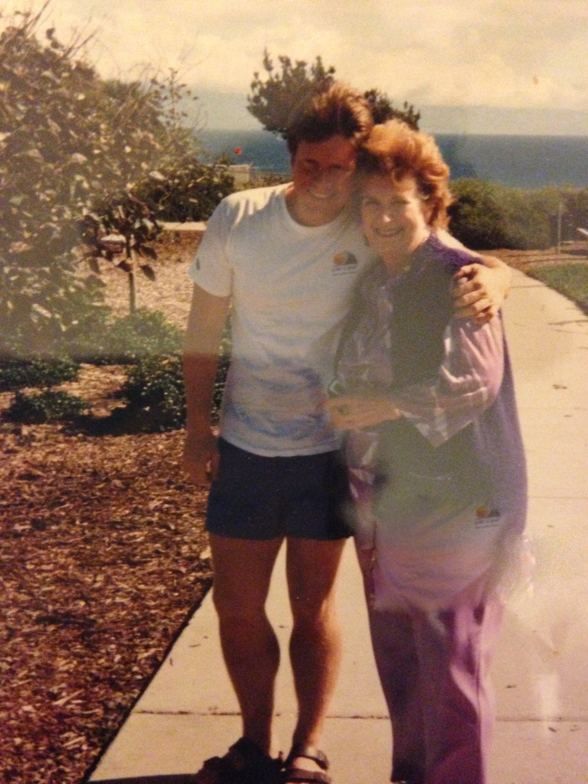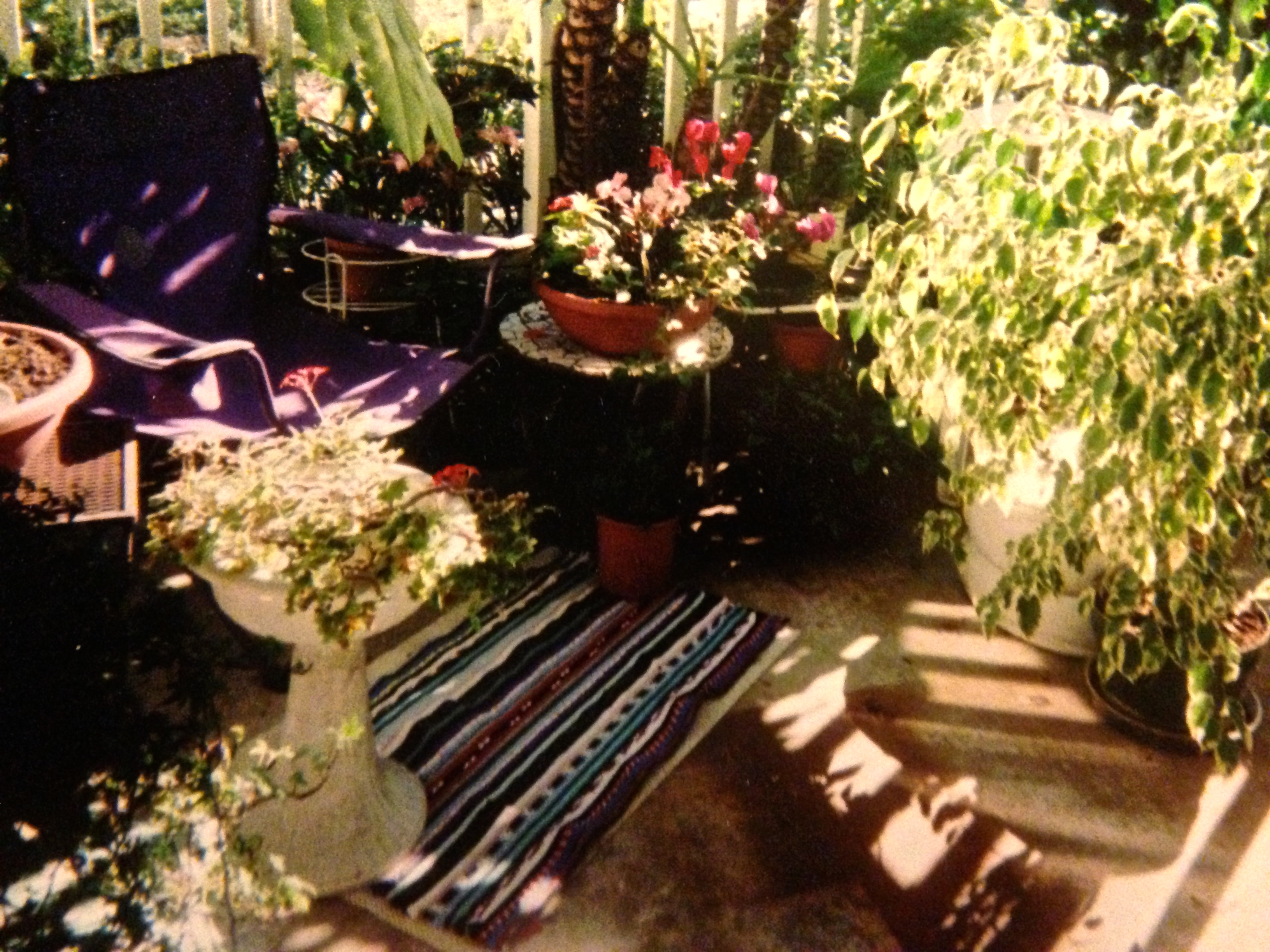 She tended the most beautiful garden when we lived on Modoc Road in Santa Barbara. There were roses of red and yellow, and there must have been some cross-pollination, because one year, we noticed some peach-colored roses popping up in between the reds and the yellows. There were hanging baskets of crimson fuchsias that attracted humming birds with their iridescent breasts shimmering in the sunlight, and there were purple and red bougainvillea plants clinging to and wrapping around the wooden posts that held up the roof of our home. There was a waxy vine right outside of our kitchen door, with flowers that had an inner wax-like star shape surrounded by petals that felt like velvet. There was a purple passion plant, twisting and clinging to the slats of wood at one corner of our fence that was visited every year by hundreds of monarch butterflies, producing an explosion of undulating color. Mummy never stopped gardening – outside her little apartment where she spent the last two decades of her life, she created a fairyland of colors and scents reminiscent of an English garden in miniature.